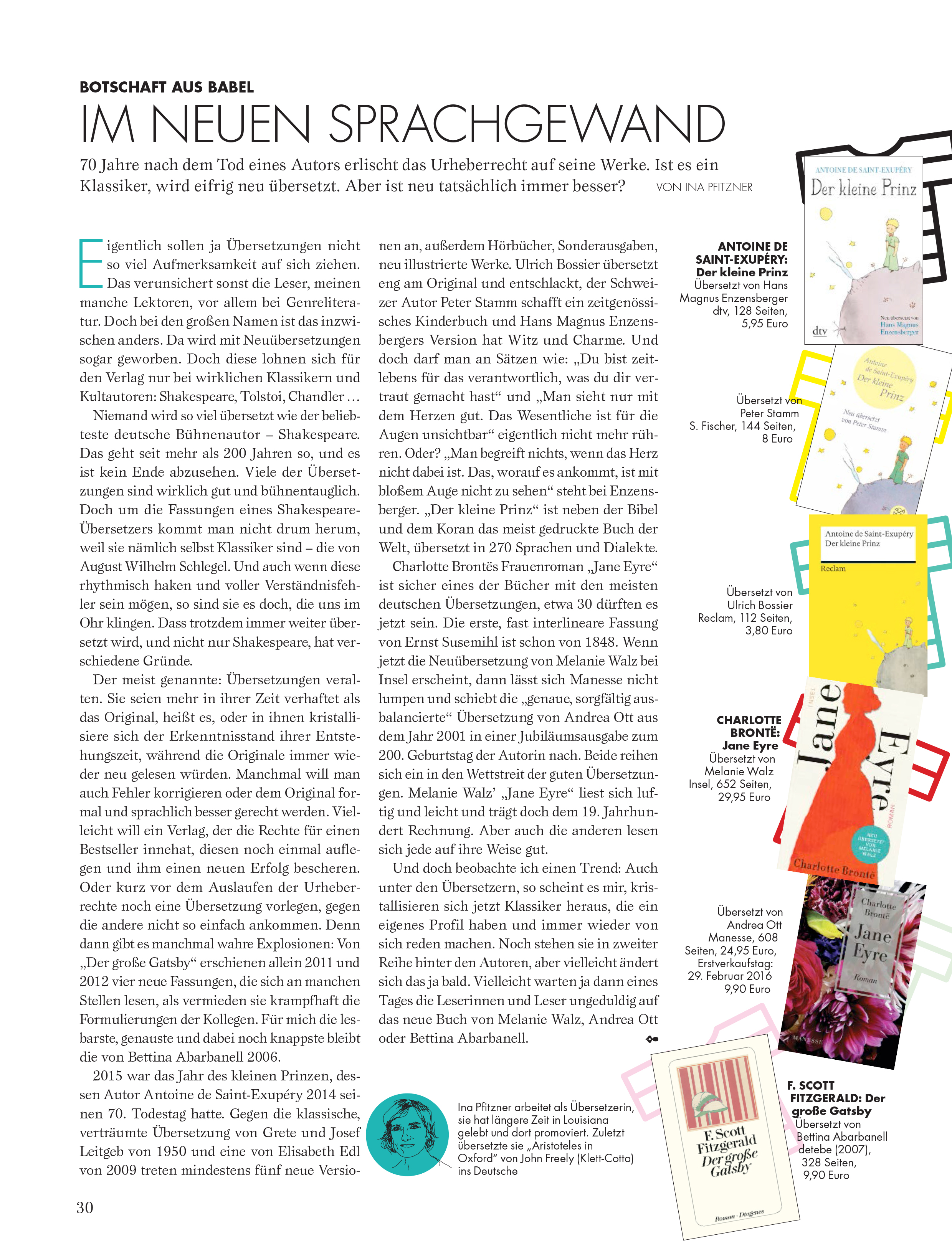 2015 war das Jahr des kleinen Prinzen, dessen Autor Antoine de Saint-Exupéry 2014 seinen 70. Todestag hatte. Gegen die klassische, verträumte Übersetzung von Grete und Josef Leitgeb von 1950 und eine von Elisabeth Edl von 2009 treten mindestens fünf neue Versionen an, außerdem Hörbücher, Sonderausgaben, neu illustrierte Werke. Ulrich Bossier übersetzt eng am Original und entschlackt, der Schweizer Autor Peter Stamm schafft ein zeitgenössisches Kinderbuch und Hans Magnus Enzensbergers Version hat Witz und Charme. Und doch darf man an Sätzen wie: „Du bist zeitlebens für das verantwortlich, was du dir vertraut gemacht hast“ und „Man sieht nur mit dem Herzen gut. Das Wesentliche ist für die Augen unsichtbar“ eigentlich nicht mehr rühren. Oder? „Man begreift nichts, wenn das Herz nicht dabei ist. Das, worauf es ankommt, ist mit bloßem Auge nicht zu sehen“ steht bei Enzensberger. „Der kleine Prinz“ ist neben der Bibel und dem Koran das meist gedruckte Buch der Welt, übersetzt in 270 Sprachen und Dialekte.