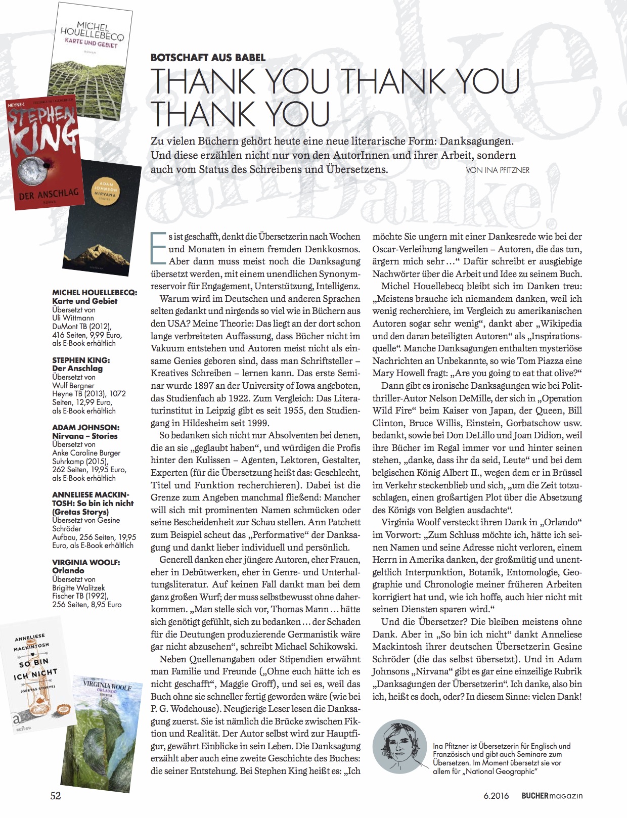 Und die Übersetzer? Die bleiben meistens ohne Dank. Aber in „So bin ich nicht“ dankt Anneliese Mackintosh ihrer deutschen Übersetzerin Gesine Schröder (die das selbst übersetzt). Und in Adam Johnsons „Nirvana“ gibt es gar eine einzeilige Rubrik „Danksagungen der Übersetzerin“. Ich danke, also bin ich, heißt es doch, oder? In diesem Sinne: vielen Dank!