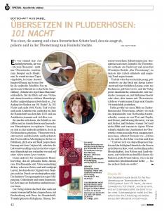 erin. So wurde sie eines Tages eingeladen, bei einer Ausstellungseröffnung im fernen Berlin die arabische Rohrflöte Nay zu spielen und während sie so durch die Ausstellung „Schätze des Aga Khan Museums“ schlenderte, fiel ihr Blick auf eine Vitrine mit einem besonders schönen Manuskript. Auf der aufgeschlagenen Seite hieß es: „Der Anfang des Buches aus 101 Nacht“. Ja, 101 Nacht und nicht 1001 Nacht. Und weil sie auch noch Arabistin war, entdeckte sie, dass die Handschrift aus dem Jahr 1235 und aus Andalusien stammte und viel älter war.