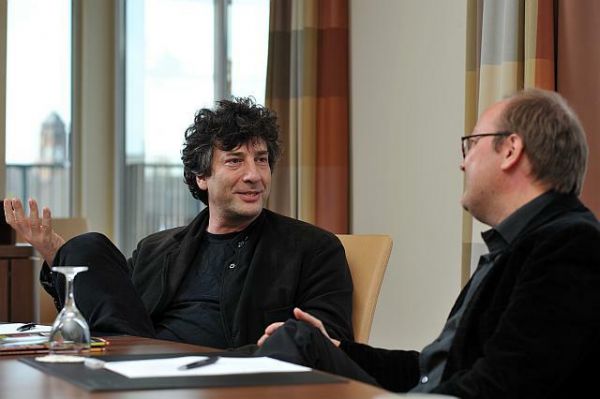 Neil Gaiman freut sich, dass auch der deutsche Sprecher seines Romans „Das Graveyard-Buch“, Jens Wawrzceck, zum hörBücher-Interview erschienen ist. Beide treffen sich zum ersten Mal und werden am Abend in einer Hamburger Kirche aus dem Buch lesen. Schon im Aufzug beginnt ein Gespräch, das im Interviewzimmer fortgesetzt wird ...