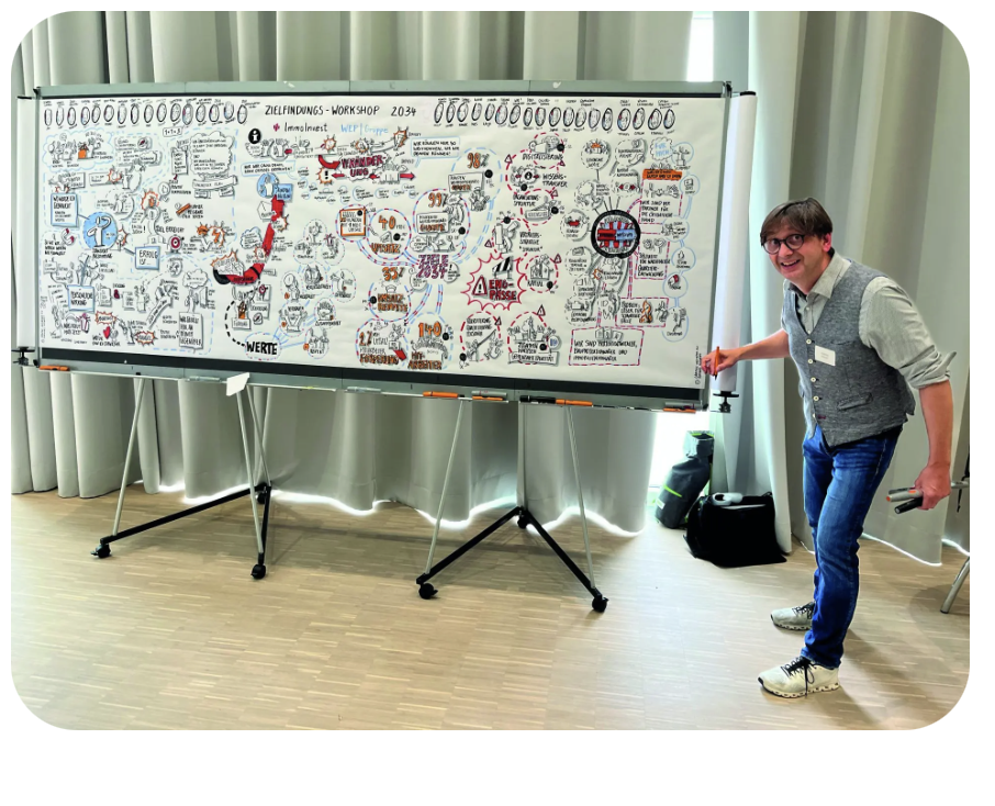 Graphic Recording wird typischerweise in Formaten eingesetzt, in denen viele Perspektiven zusammenkommen: Strategie- und Visionsworkshops, Veränderungsprozesse, Retrospekt, Konferenzen, Führungsklausuren oder moderierte Gesprächsformate wie Kaminsitzungen Der Mehrwert zeigt sich besonders dort, wo Komplexität hoch ist und Gesprächsdynamiken leicht zu Wiederholungen oder Parallel-Diskussionen führen. Die Visualisierung schafft eine Referenzfläche und erleichtert es Teilnehmenden, ohne es erneut zu erklären, an das bereits Gesagte anzuschließen. Nutzen im Prozess ein gemeinsames Referenzbild. Fachlich betrachtet erfüllt Graphic Recording zwei Funktionen: Prozessunterstützung und Dokumentation. Im Prozess wirkt dies als „Gedächtnis“. Dies kann Verständnisfragen reduzieren, Zusammenhänge sichtbar machen und Prioritäten klären. In der Dokumentation entsteht ein Ergebnisbild, das über das reine Maßnahmen-Listing hinausgeht, weil auch Kontext und Begründungslogik erkennbar bleiben. Für Folgekommunikation (Nachbereitung, Onboarding) ist das häufig anschlussfähiger als reine Fließtexte.